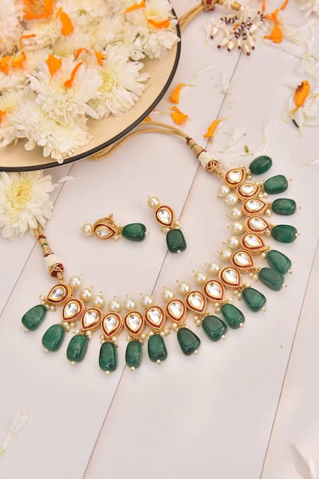 Gold finish with pearl and green stone drops, Handcrafted design with intricate details, Pull out-drawcord closure for necklace