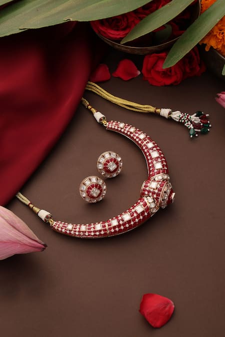 Shop_Swabhimann_Red Stones, Rhinestones Kundan Embellished Necklace Set _Online_at_Aza_Fashions