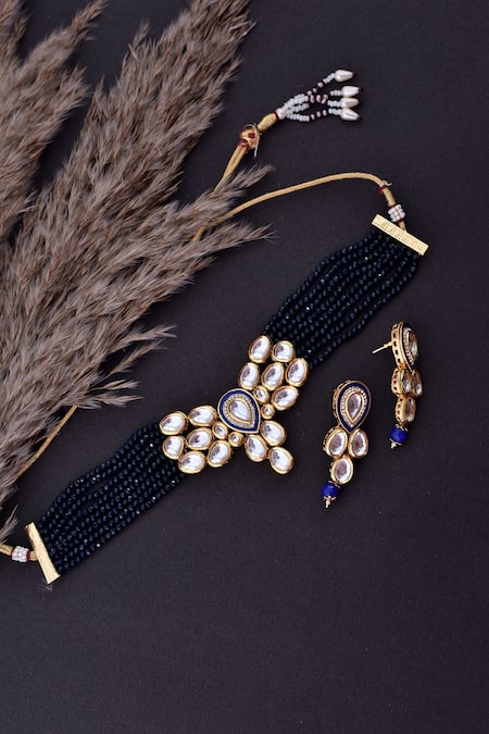 Gold tone necklace set featuring kundan embellishments in a geometric cut-work pattern. Paired with matching earrings, accentuated with blue beaded strings.
