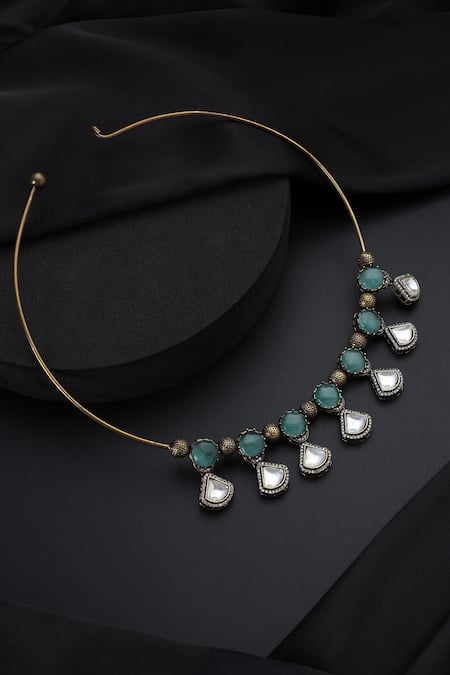 A gold-plated brass hasli necklace featuring mint-colored stones and polki embellishments.