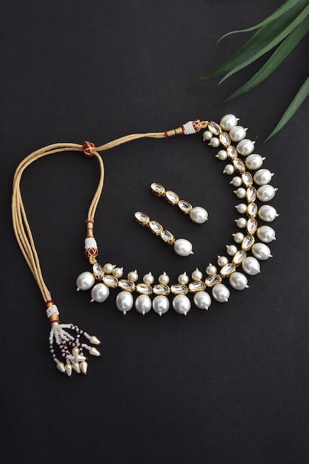 Gold toned necklace featuring kundan and pearl embellishments. Paired with tiered drop earrings adorned with similar detailing.