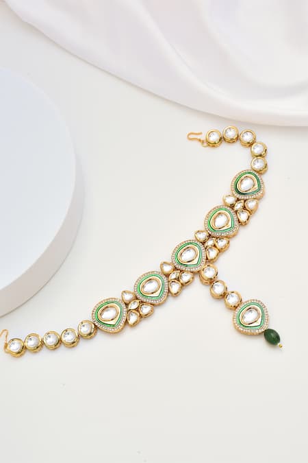Gold toned mathapatti featuring polki stones and green enamel detailing