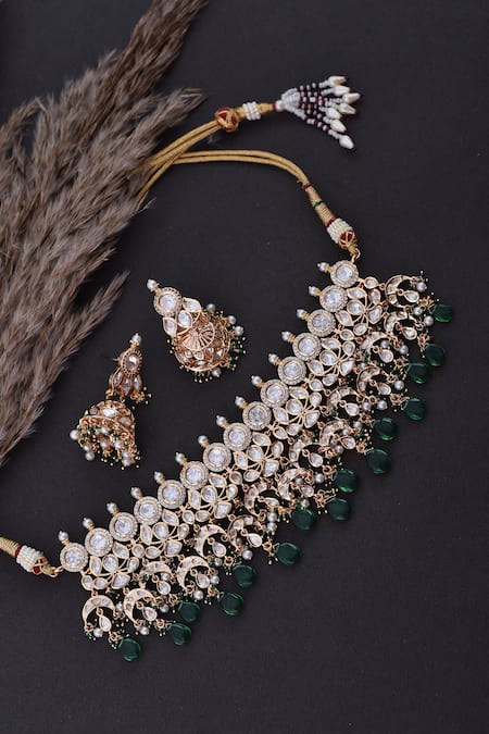 Buy_Swabhimann_Green Diamonds, Stones Polki Embellished Necklace Set _Online_at_Aza_Fashions