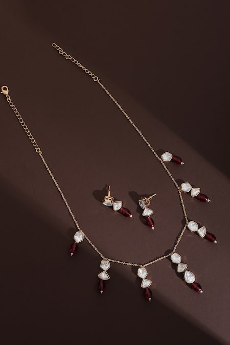 Rose gold plated necklace embellished with polki and red stones. Paired with matching earrings featuring similar embellishments.