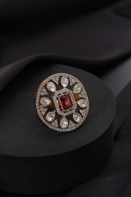 A gold-plated brass ring featuring a central red polki stone surrounded by clear polki stones in a circular design.