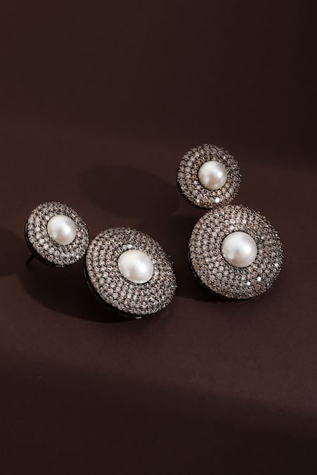 Buy_Swabhimann_White Pearls, Crystals Rhodium Plated Round Drop Earrings _at_Aza_Fashions
