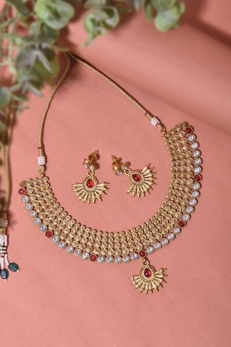 Gold tone necklace featuring ruby synthetic stone embellishments and a geometric pattern. Paired with matching earrings that complement the necklace design.