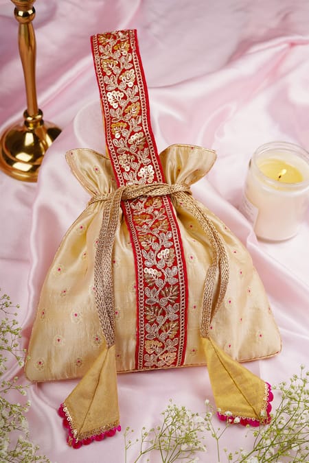 Embroidered handle with intricate floral patterns, Drawstring closure with decorative tassels