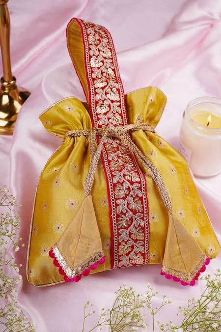 Yellow silk potli featuring a woven butti base with an embroidered attached handle