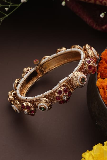 Gold plated kada featuring jadau multicolour stone and pearl embellished motifs
