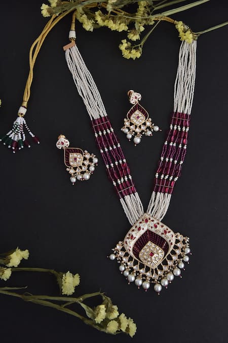 Red Diamonds, Pearls Uncut Polki Studded Necklace Set