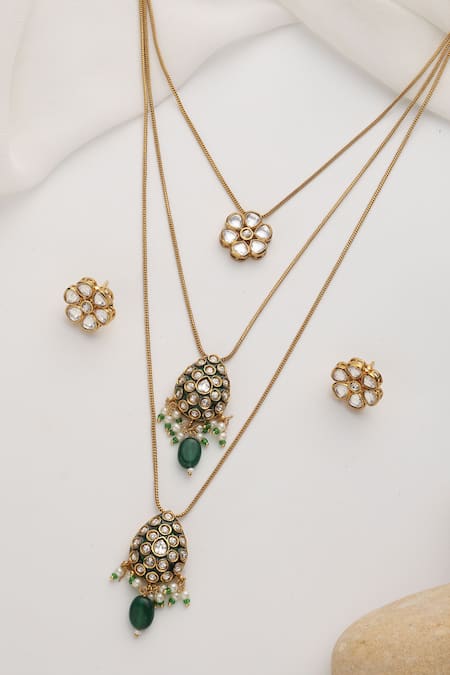 Intricate floral design on earrings, Layered necklace with polki stones, Green stone embellishments on necklace