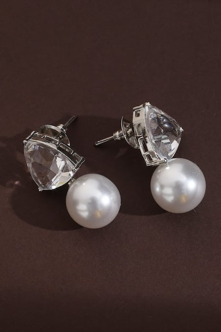 White stud earrings featuring a droplet design with zirconia and pearl embellishments. Made from brass with rhodium plating for a luxurious finish.