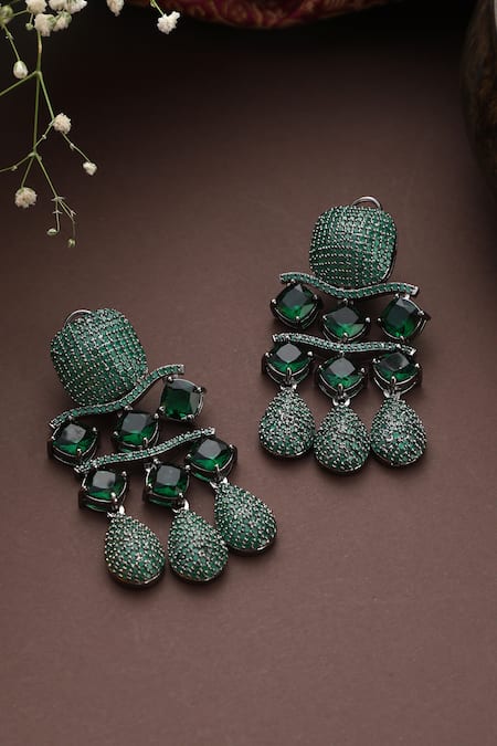 Rhodium plated with silver tone finish, Green zirconia embellished drop motif, Push back closure for secure fit
