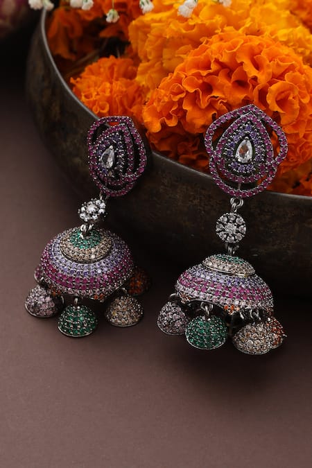Multicoloured zirconia embellishments, Rhodium plating for a silver tone finish, Unique jhumka design with intricate detailing