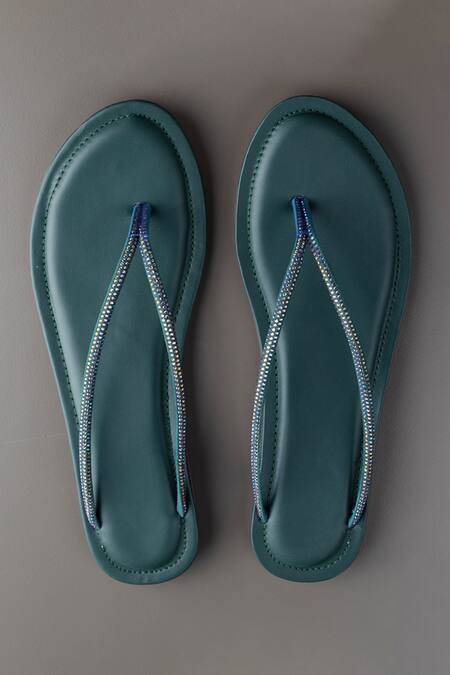 Green slippers with swarovski embellishment on strap & split toe detailing.