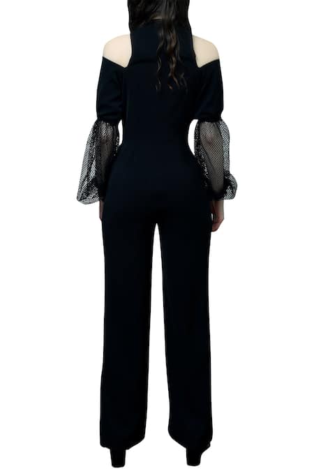 Buy_Swatee Singh_Black Mesh, Crepe Blend Round Cold Shoulder Jumpsuit _Online_at_Aza_Fashions