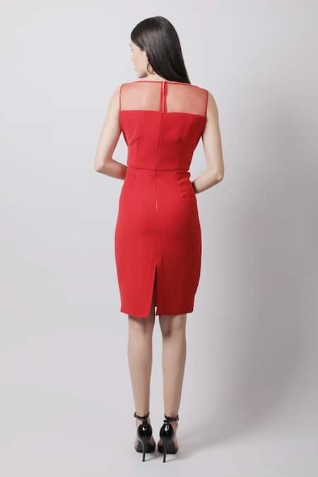 Red short hem dress in crepe base fabric with front panelled layer, sheer yoke & back slit.