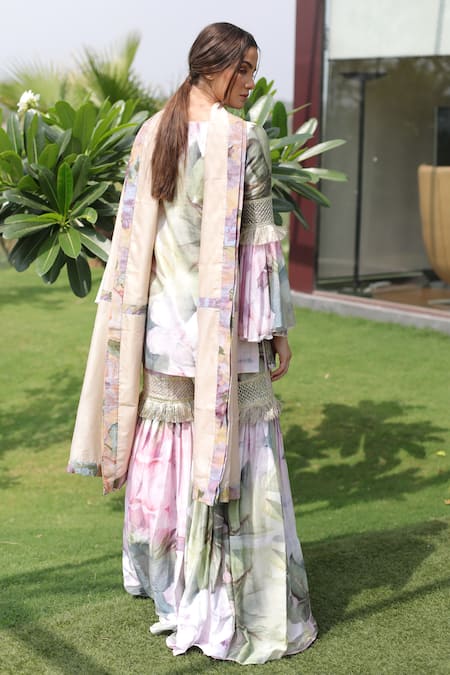Ivory georgette kurta featuring floral prints and flared sleeves. Paired with a sharara and a matching dupatta, both adorned with floral designs.