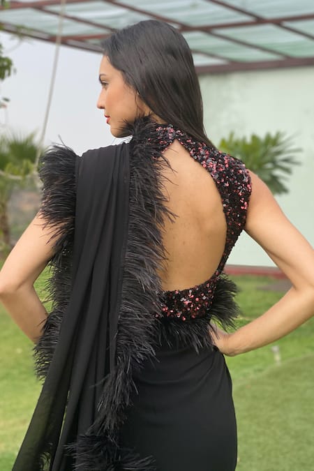 Black georgette saree featuring feather detailing. Paired with a sequins embroidered halter neck blouse.