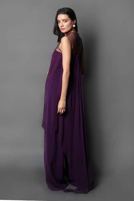 Purple heavy crepe and georgette jumpsuit featuring a sheer neckline and handkerchief drape