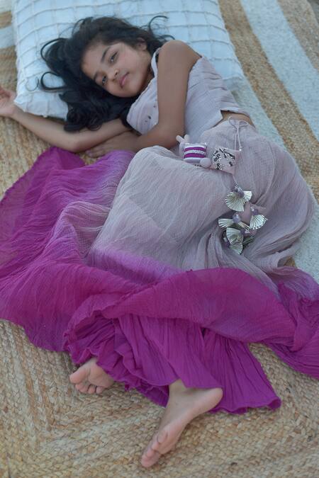 Old rose pink lehenga featuring embroidered details and a side tassel tie-up. Paired with a ruched, embroidered sleeveless top in Kota Doriya fabric.