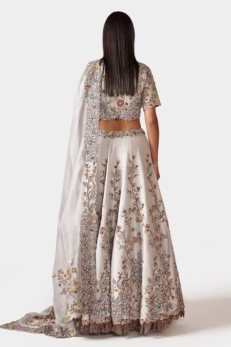 Ice blue, grey lehenga with multicolor floral embroidered motifs and tassel detail at the hem. Comes with blouse and organza dupatta.