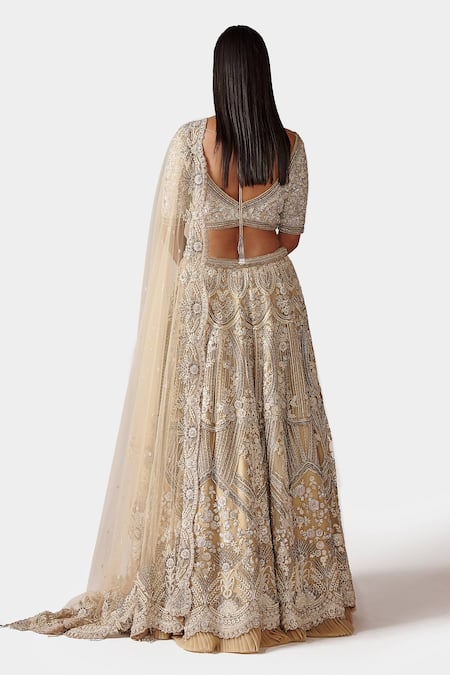 Beige Net And Crepe Crystal, Pearls & Sequin, Sunat Embroidered Bridal Lehenga Set
