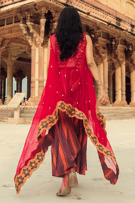 Maroon Chanderi , Organza Open Asymmetric Cape And Draped Pant Set