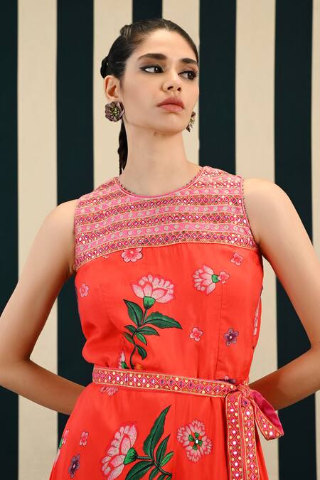 Red Habutai Silk Chinar Poppy Bloom Print Jumpsuit With Belt
