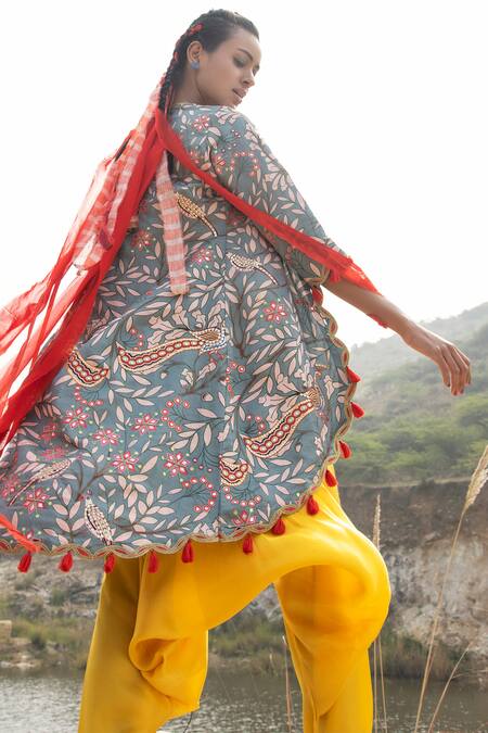 Grey jacket with embellished detail & floral print all over. Paired with kurta & draped pants.