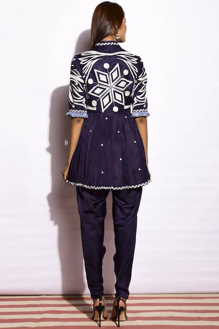 Navy blue peplum kurta with applique work. Comes with dhoti pant.
