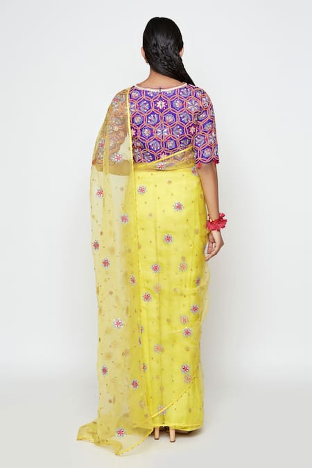 Yellow sheer saree with sequin embroidered floral motifs. Comes with blouse.