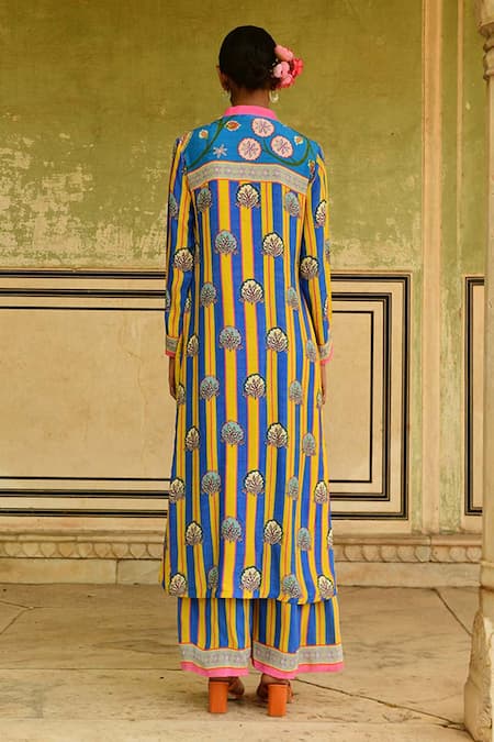 Buy_Swati Vijaivargie_Blue Silk Embroidery, Beads Mandarin Collar Gauri Floral Printed Kurta _Online_at_Aza_Fashions