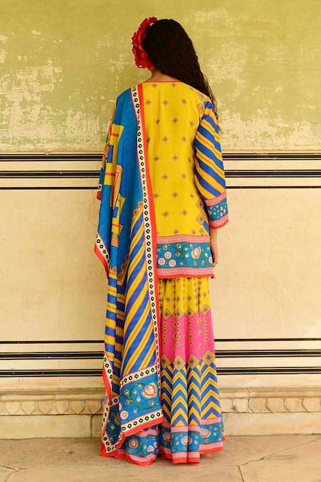 Multi-colored silk kurta featuring hand embroidery and a chevron print. Paired with a matching sharara and dupatta, showcasing vibrant patterns and designs.