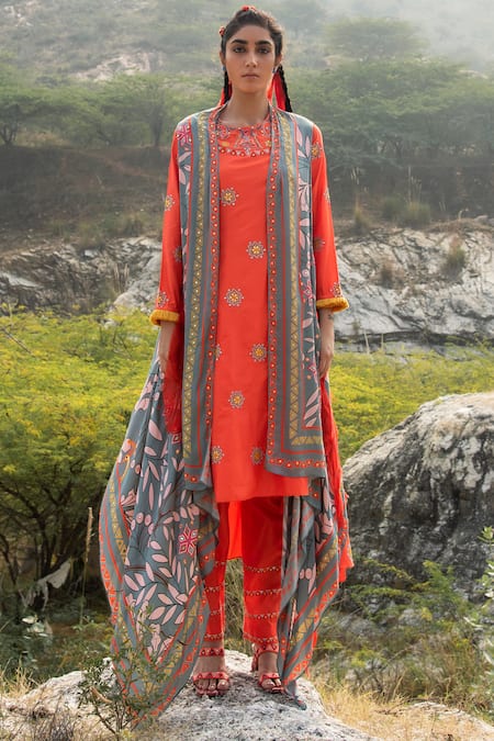 Grey asymmetric cape with embellished detail & floral print all over. Paired with kurta & pants.