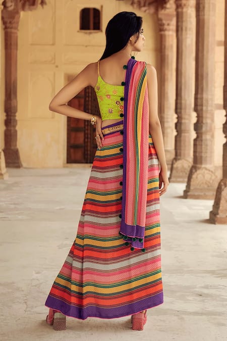 Multicolored pre-stitched saree with contrast printed stripes. Paired with neon green floral embroidered blouse.