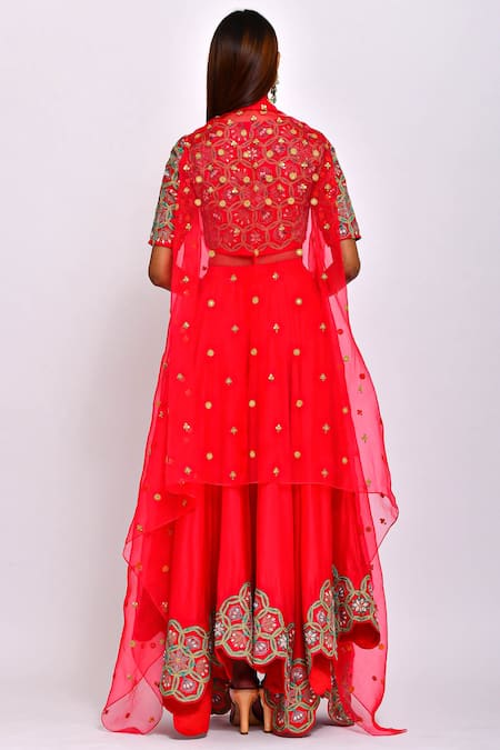 Red crop top with all-over floral motif work. Comes with asymmetric lehenga & embellished long jacket.