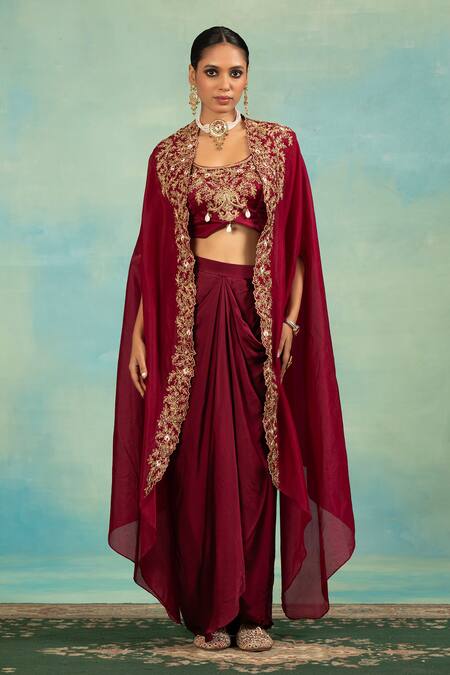 A deep wine crepe blouse and dhoti skirt set featuring intricate dori work and cutdana embellishments. This ensemble is paired with an organza cape, also adorned with dori work and cutdana.