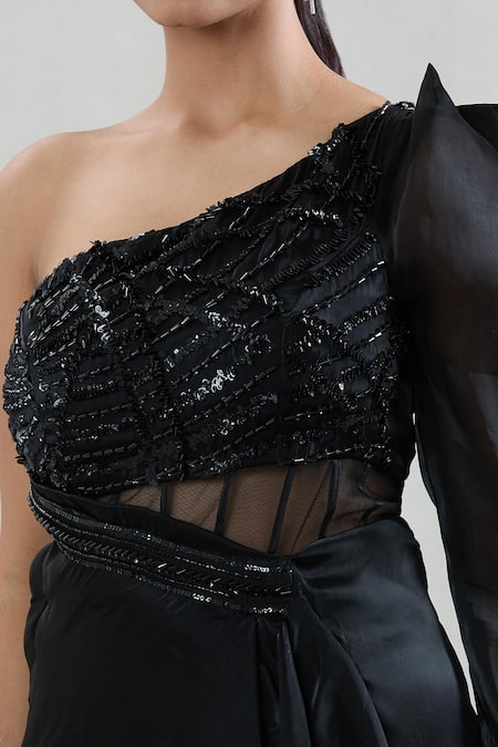 Black Organza Sequins, Beads One Shoulder Luxe Draped Gown