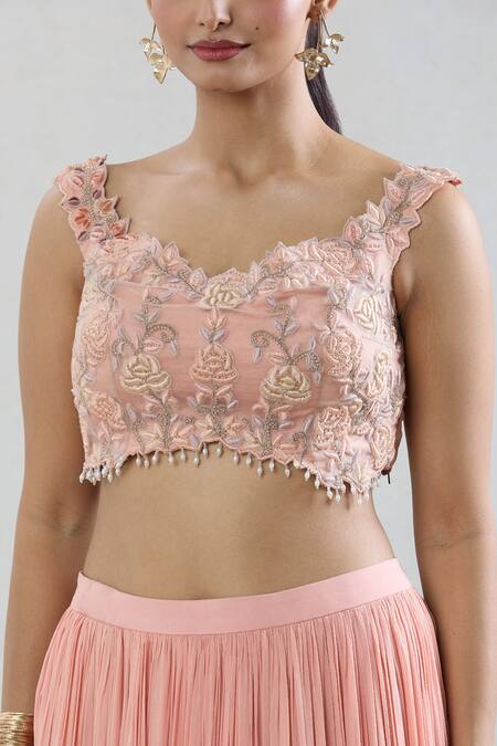 Peach pleated lehenga made from organza and georgette. Paired with a sleeveless blouse featuring resham embroidery and pearl embellishments.