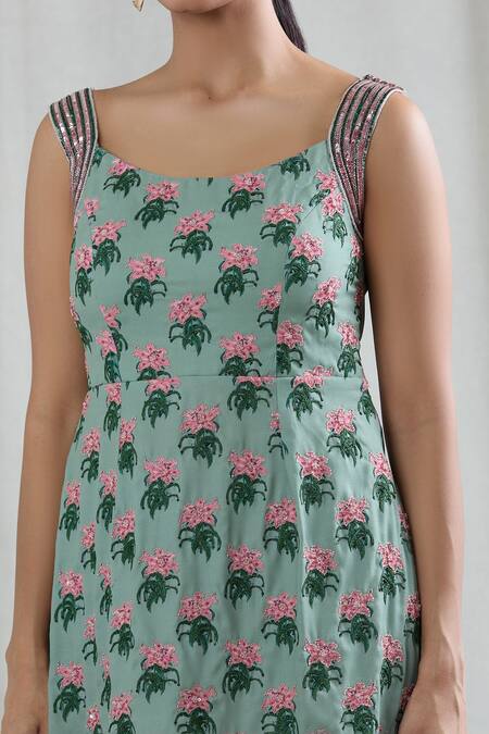 Green Crepe Sequins Scoop Neck Rani Floral Print Panelled Tunic Pant Set