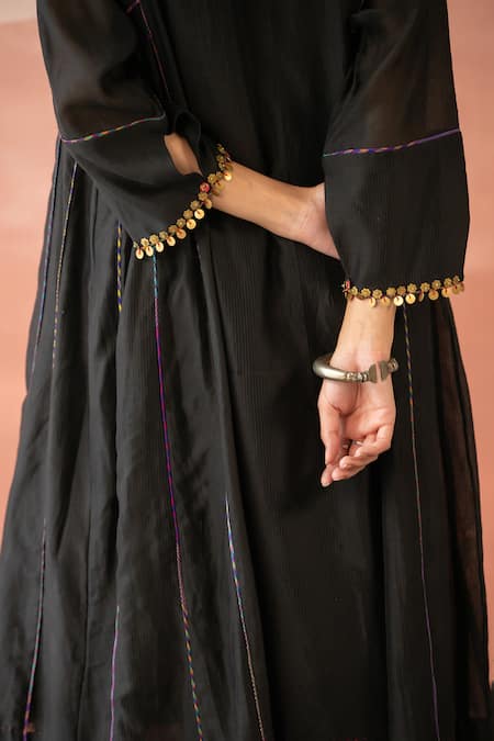 Black kurta featuring a round neckline, three-quarter sleeves, and front button closure. Paired with a matching slip made of 100% cotton.