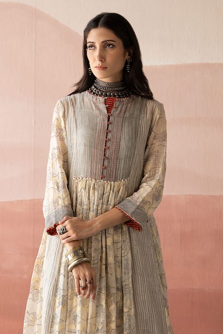 White kurta featuring floral hand block print and bead embroidered placket. Paired with a slip for added comfort.