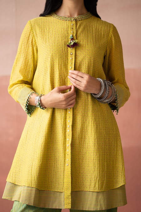 Yellow Handloom Cotton, Chanderi Beads Bandeau Neck Majeed Polka Dot Print Tunic