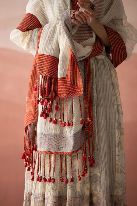 Bone white and passion red dupatta featuring stripe hand block print with tassel embroidered border