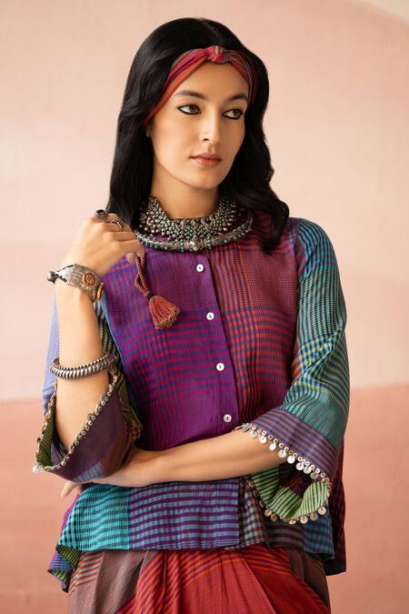 Bead embellished sleeve hem, Checkered woven motifs, Relaxed fit design