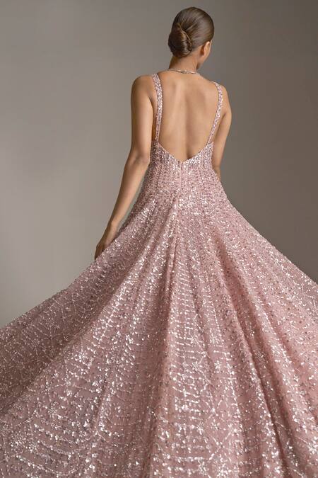 Pink Net Sequins In Geometric Pattern Plunge Sweetheart Neck Embroidered Gown