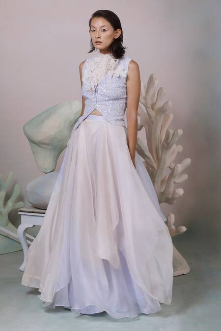 Lilac and beige pink ombre lehenga with draped layers. Paired with an embroidered choli and detachable collar.