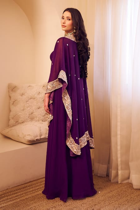 Purple cape featuring Noor bahar embroidery on the borders with sequin, cutdana, and bead highlights. Paired with a cutout detail blouse and flared pant.